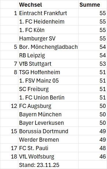 | 5 | TSG Hoffenheim | 12 | 25 | 17 | 8 | 23 |