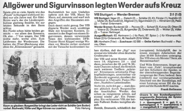 Vor 40 Jahren: bezwang Werder Bremen an einem Freitagabend den VfB Stuttgart mit 6:0 und untermauerte seine Tabellenführung. Drei Akteure trafen dabei doppelt: Manfred Burgsmüller, Michael Kutzop und Frank Ordenewitz. Am Saisonende wurde das Team von Trainer Otto Rehhagel nur Vizemeister hinter dem punktgleichen FC Bayern München, weil es im letzten Spiel in Stuttgart 1:2 unterlag.
